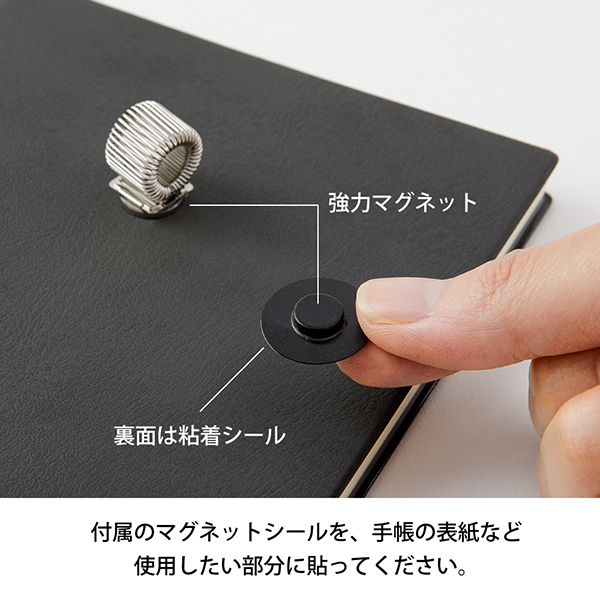 付属のマグネットシールを、手帳の表紙など使用したい部分に貼ってください。マグネット部分には、カチッと着く感触が気持ちよい、強力マグネットを採用しています。