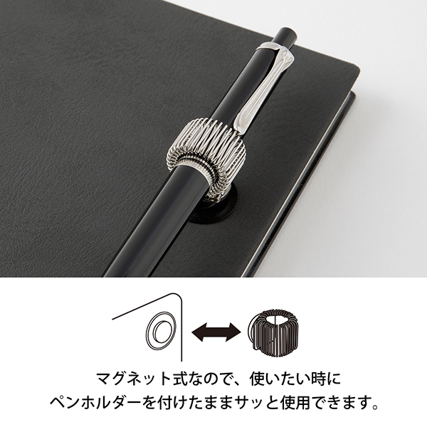 付属のマグネットシールにより、好きな場所にホルダーを付けることができます。手帳やクリップボードに留めて持ち歩くのはもちろん、玄関や冷蔵庫など、筆記具が必要になる場所にお使いいただくのもおすすめ。また、バネ式のペンホルダーは、ペン以外にも直径10mm以上の印鑑やチョークなどを挿しこむことが可能です。
