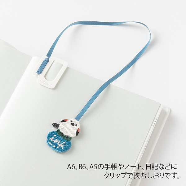 手帳やノート、日記帳、読みかけの本にクリップを挟み込むだけで使える、刺繍チャーム付きのしおりです。 シンプルな手帳やノートもかわいく便利にカスタマイズできます◎クリップを挟み込んでいるだけなので、繰り返しお使いいただけます。