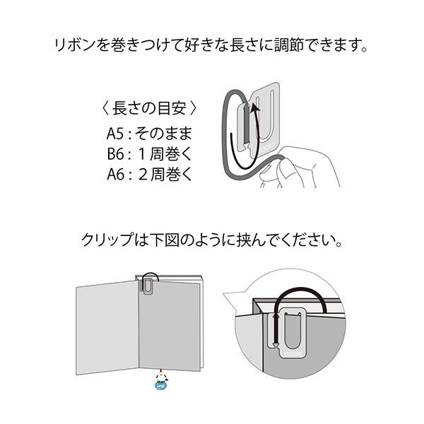 リボンをクリップ部分に巻きつけることで長さを調節できます。