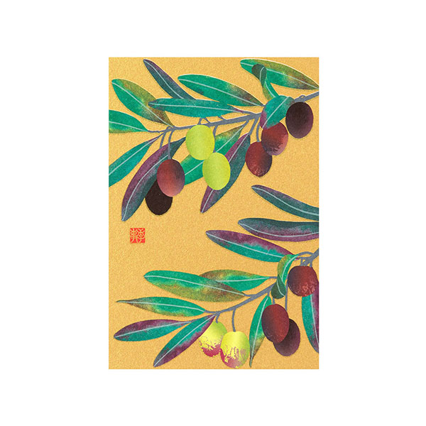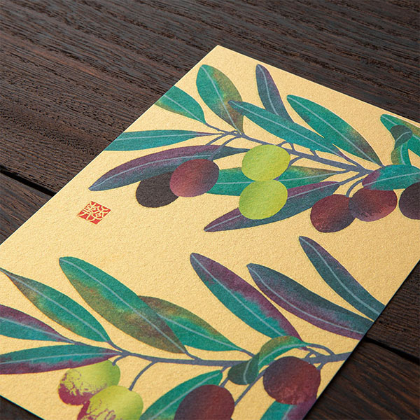 上品な和紙の質感と、日本の四季を感じるデザインが人気の「紙シリーズ」。風合いのある越前和紙に、艶やかに色づく「オリーブ」が大胆に描かれたポストカードです。