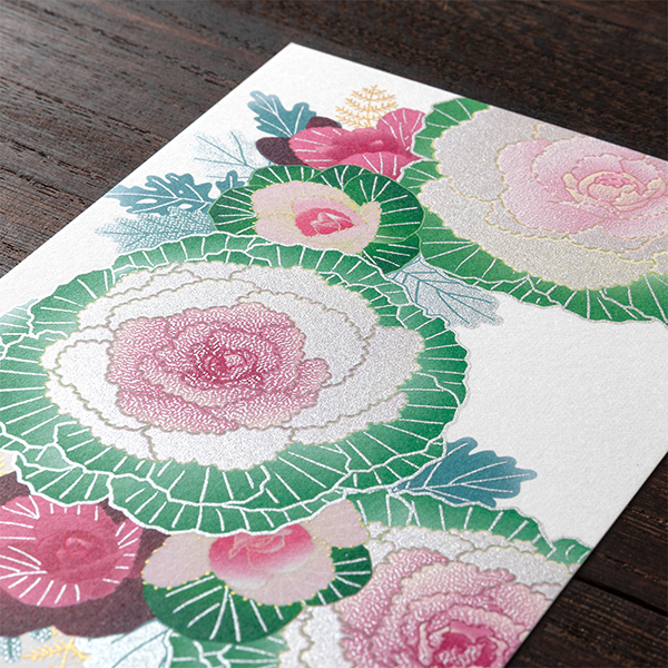 風合いのある越前和紙に、華やかなリース状の葉牡丹が大胆に描かれたポストカードです。