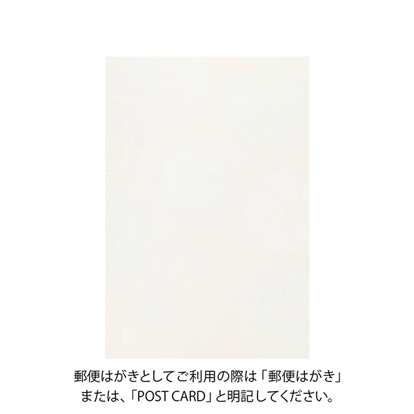 | 備考 | ・郵送はがきとしてご利用の際は、はがきの宛名面に「郵便はがき」または「POST CARD」と明記してください。 ・本製品はシルクスクリーン印刷のインキによるにおいが、まれに残っている場合がありますが人体に影響はありません。 ・ご使用になる筆記具によっては、はじいたり、にじむ場合がありますのでご注意ください。 ・和紙には樹皮等の原材料が混入している場合があります。 |