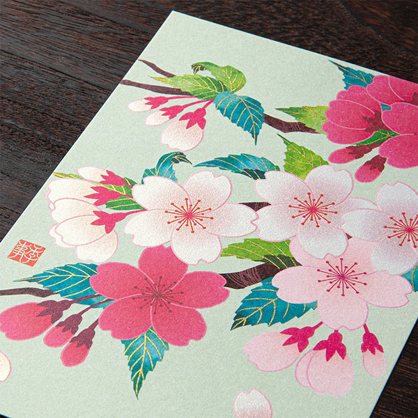 風合いのある越前和紙にシルク印刷に、艶やかに咲き誇る「桜」が大胆に描かれたポストカードです。