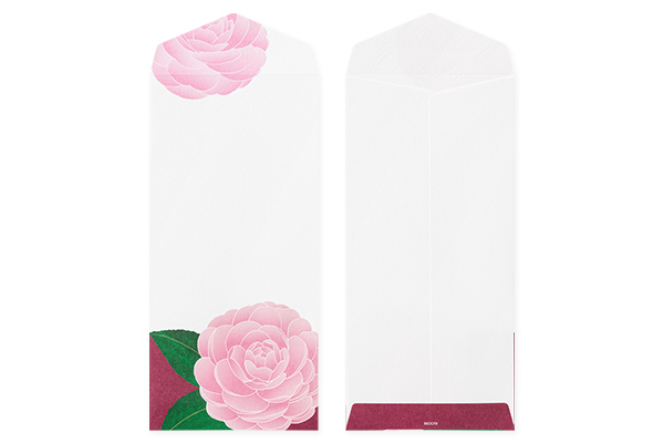 艶やかに咲くピンクの乙女椿が、パール箔の優しい輝きで美しく表現されています。年賀状、寒中見舞い、お歳暮の返礼状などにぜひご活用ください。
