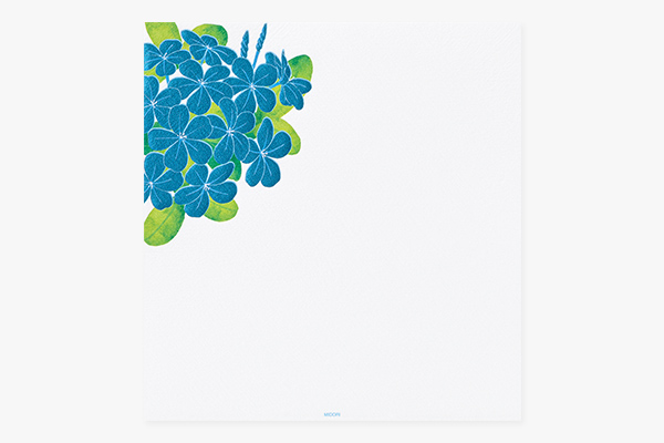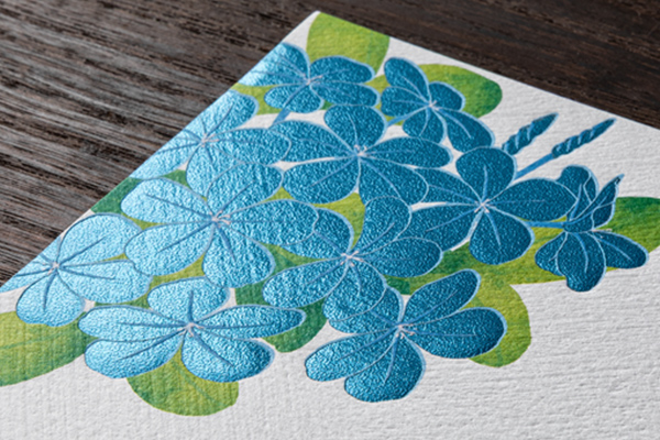 晩夏まで長期間にわたって次々と開花するルリマツリ。涼しげなルリ色の花を、青いメタリック箔で表現しました。