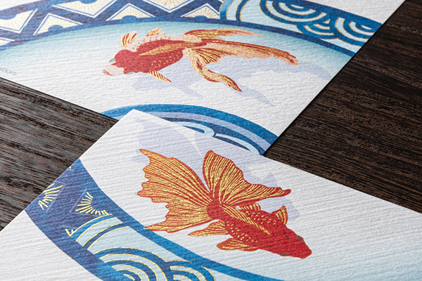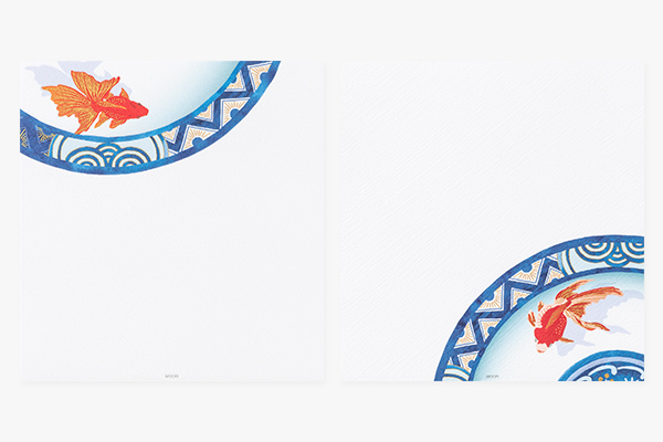 青絵鉢に泳ぐ金魚に繊細な金シルク印刷を施し、涼しげな夏の風景を表現しました。