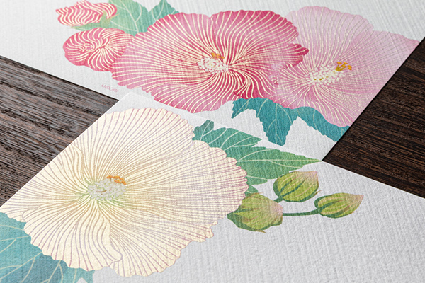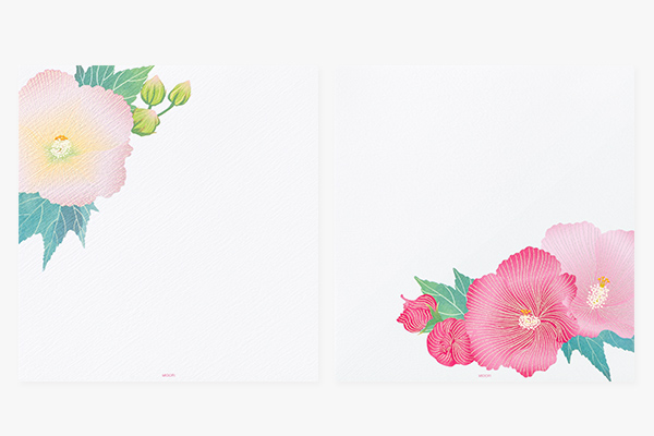 朝、咲き始めの白色から夕方、ピンクへと花色が変化する様子が、お酒に酔っているようだと名付けられた「酔芙蓉」。そんな不思議な花色を、角度によって色が変わり輝く偏光パールシルク印刷をのせて表現しました。