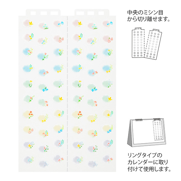 シートの切れ込み部分をカレンダーのリング部分に装着することができます。シートは中央のミシン目で2分割できるので、少しずつ使用したり、同時に2つのカレンダーに使用するなど便利にお使いいただけます◎