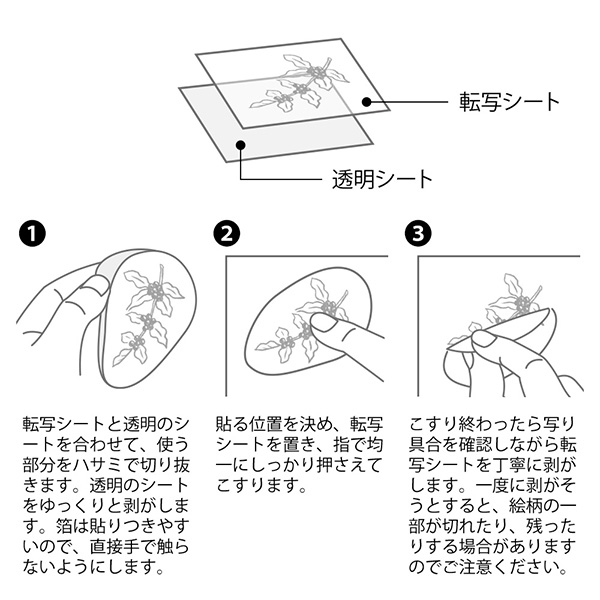 | ご使用にあたって | ◯箔は貼り付きやすいので、直接手で触らないようにしてください。 ◯表面に凹凸がある素材に貼りつけると、シールが割れたり、転写する場所を傷つける恐れがあります。 ◯本革や合成皮革・プラスチックなどにもご使用いただけますが表面に凹凸がある素材や、油分を含む素材には適しておりません。 ◯本製品は金属・陶器・ガラスなどの素材には適しておりません。 ◯使い残した転写シートは、絵柄が剥がれてしまう恐れがあるため、透明のシートを合わせたまま袋に入れて保管してください。 |