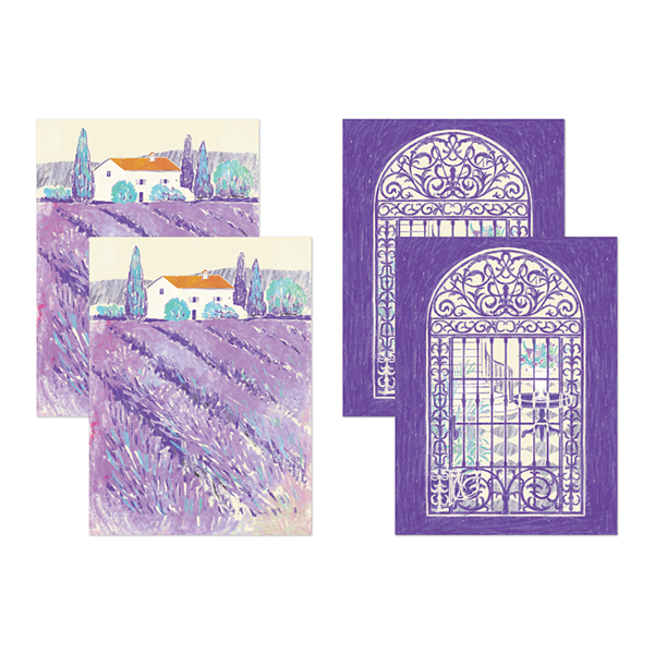 裏テーマはフランス。無限に広がるいつかのラベンダー畑や、どこからかラベンダーの香りを感じるような紫色のモチーフ。どこか懐かしさを感じさせる、ヨーロッパの古い絵本のようなイラストをたっぷりと詰め合わせました。