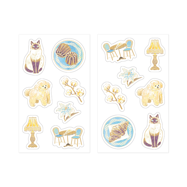 裏テーマはフランス。焼きたてのクロワッサンとカフェラテに、街で出会ったかわいいイヌやネコなど、心がふっとゆるむようなモチーフ。どこか懐かしさを感じさせる、ヨーロッパの古い絵本のようなイラストをたっぷりと詰め合わせました。