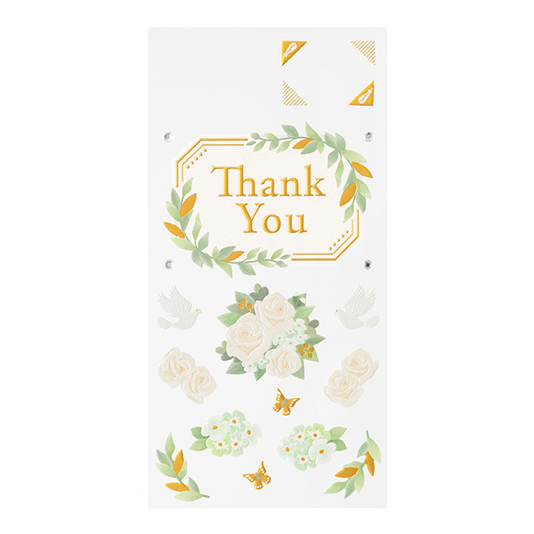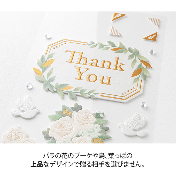 「グリーンブーケ柄」は、爽やかな白いお花や鳥、葉っぱのモチーフで、お祝いや送別のシーンにぴったり◎友人、同僚、先輩、上司、家族など贈る相手を選ばないデザインです。
