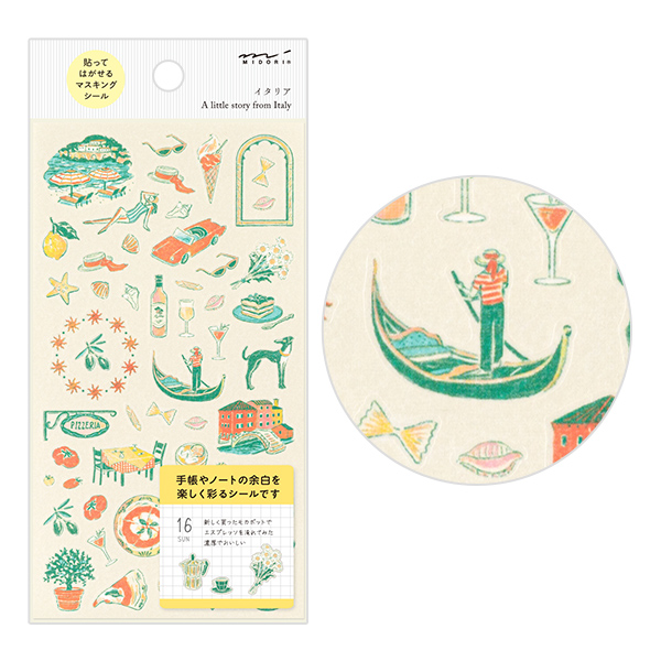 手帳やノートのデコレーションに使いやすい、大小のモチーフがたっぷり入ったシールです。ストーリー性のあるシールで、イタリアならではのモチーフや伝統的な柄をあしらったフレームの絵柄が入っており、デコレーションしながら旅気分が味わえます。