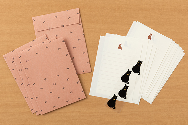 ぬくもりある風合いの紙を使用した封筒には、黒猫の蝶ネクタイとお揃いのリボン模様がデザインされています。