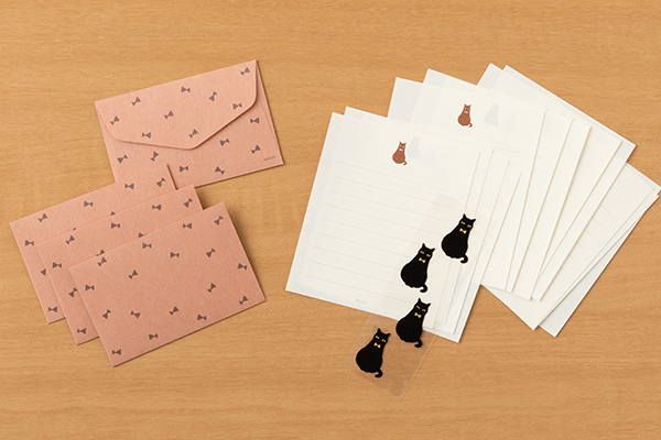 ぬくもりある風合いの紙を使用した封筒には、黒猫の蝶ネクタイとお揃いのリボン模様がデザインされています。