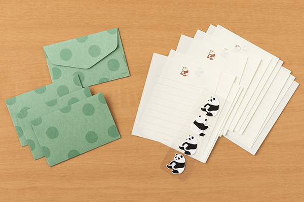 ぬくもりある風合いの紙を使用した封筒には、パンダが転がして遊ぶボールをイメージした柄がデザインされています。