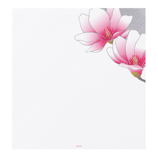 美しくしなやかな木蓮の花の一部が銀シルク印刷となっており、上品に輝きます。年賀状、寒中見舞い、お歳暮の返礼状などにぜひご活用ください。