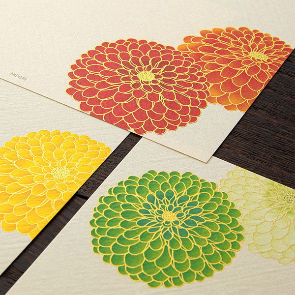 花びら1枚1枚に上品な金シルク印刷が繊細に施され、鮮やかな花色のポンポン菊が大胆に表現されています。秋の夜長、ゆっくりとしたためるお手紙や、秋のお誘いの便りにぜひご活用ください。