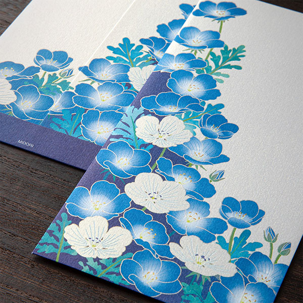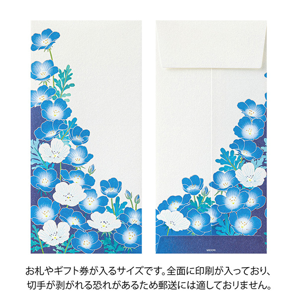 上品な和紙の質感と、日本の四季を感じるデザインが人気の「紙シリーズ」。風合いのある越前和紙に、ネモフィラが大胆に描かれた多目的封筒です。