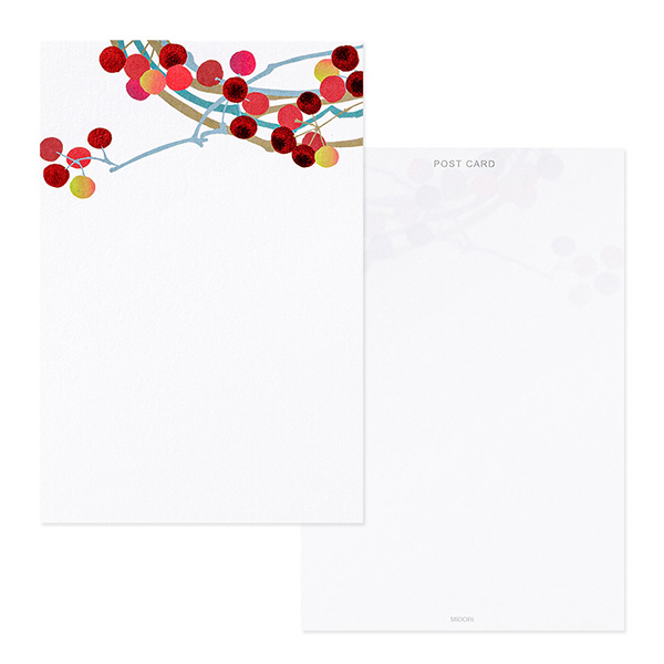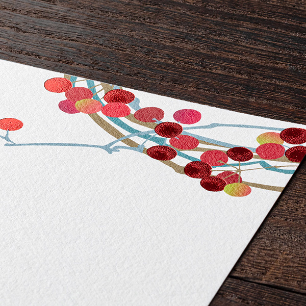 赤い山帰来の実がメタリック箔押しできらびやかに表現されています。年賀状、寒中見舞い、お歳暮の返礼状などにぜひご活用ください。