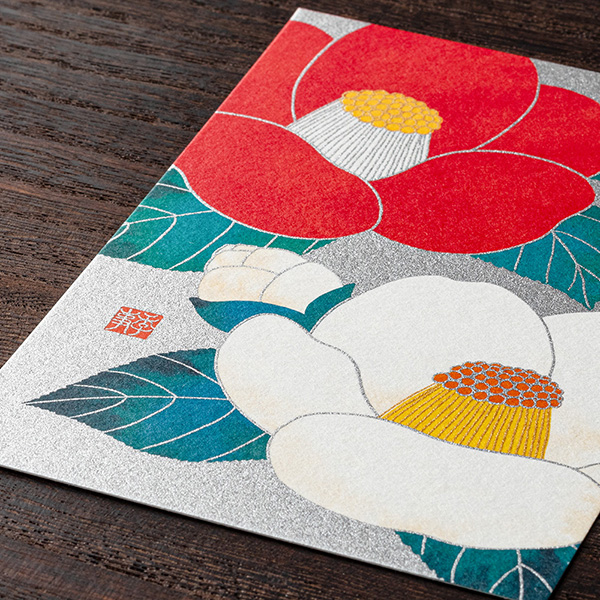 風合いのある越前和紙にシルク印刷で、紅白つばきを映したポストカードです。
