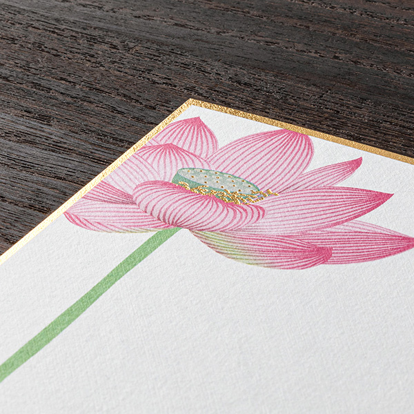 はがき枠と花に金箔が施され、蓮が生き生きとした質感で大胆に表現されています。