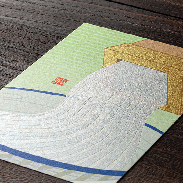 千年以上もの長い歴史と伝統に育まれた「越前和紙」に、シルク印刷が施されたポストカードです。繊細な金と銀のシルク印刷が上品に輝きます。