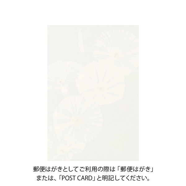 | 備考 | ・郵送はがきとしてご利用の際は、はがきの宛名面に「郵便はがき」または「POST CARD」と明記してください。 ・本製品はシルクスクリーン印刷のインキによるにおいが、まれに残っている場合がありますが人体に影響はありません。 ・ご使用になる筆記具によっては、はじいたり、にじむ場合がありますのでご注意ください。 ・和紙には樹皮等の原材料が混入している場合があります。 |