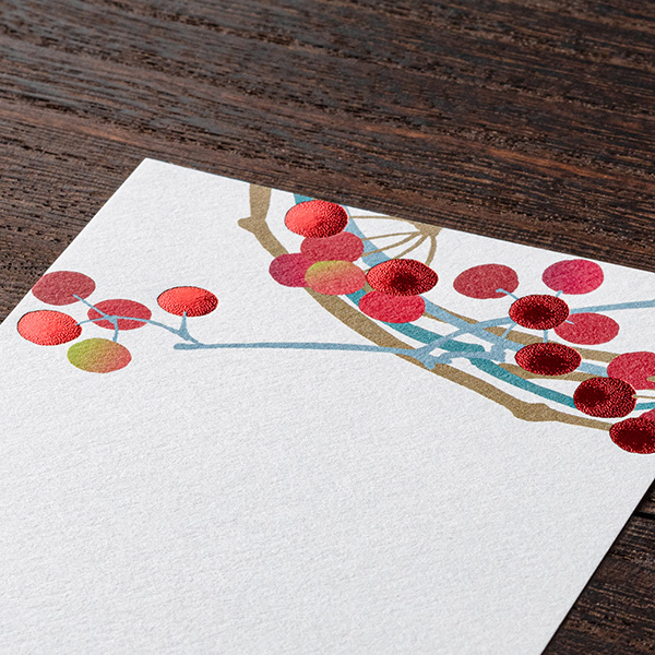 赤い山帰来の実がメタリック箔押しできらびやかに表現されています。年賀状、寒中見舞い、お歳暮の返礼状などにぜひご活用ください。