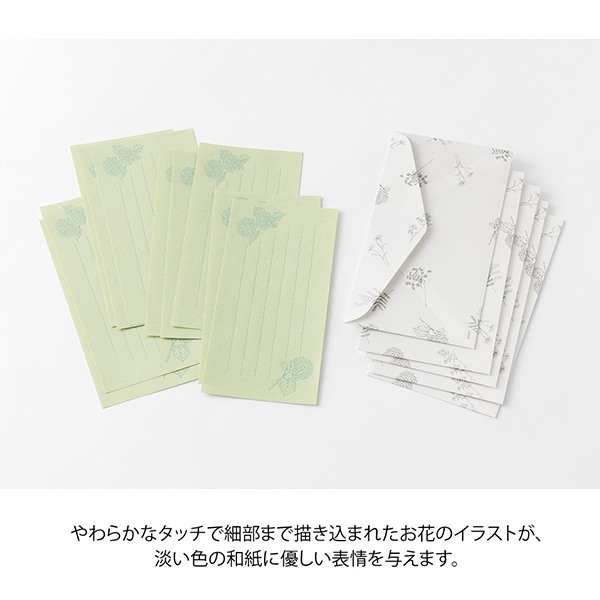 パッケージと一筆箋・封筒に描かれたお花はイラストレーターの「ささき めぐみさん」の手によるものです。やわらかなタッチで細部まで書き込まれたお花の絵は、淡い色の和紙に優しい表情を与えています。