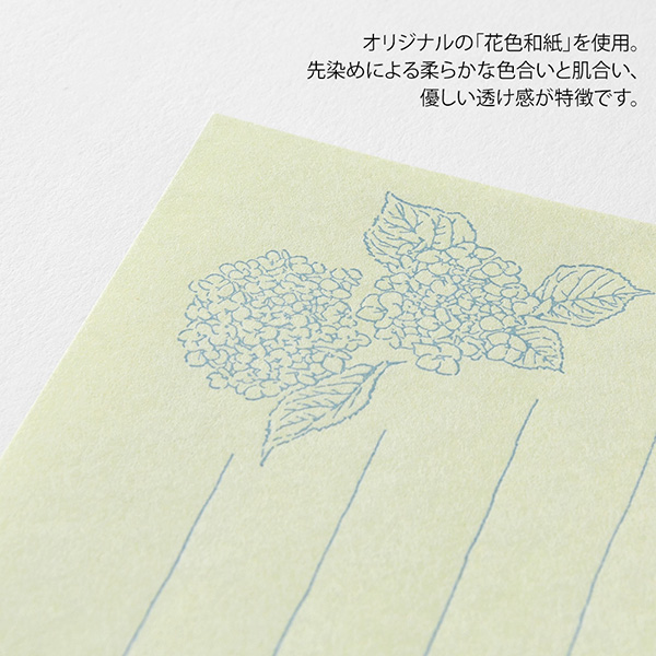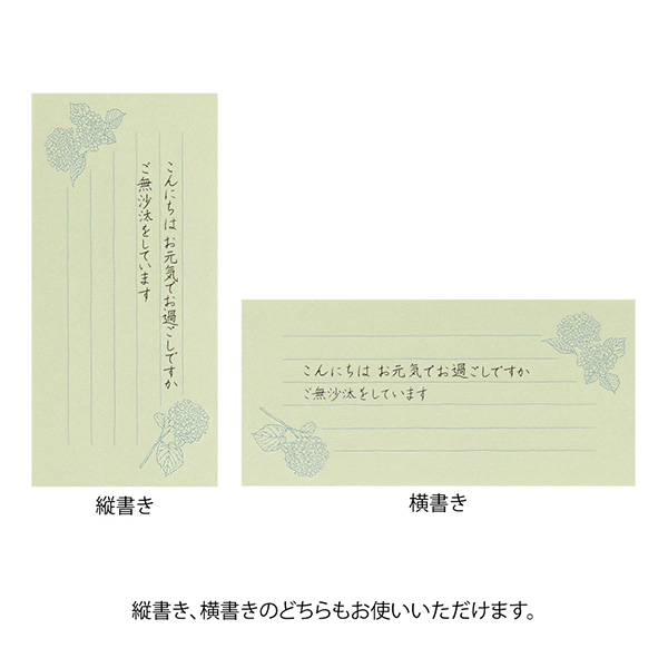 便箋は、花の絵柄と和紙の色を活かした、ゆったりとしたレイアウトで、縦書きでも横書きでも使える両用タイプです。