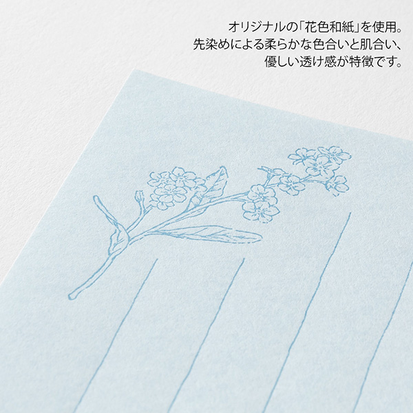 オリジナルで抄紙した先染めの越前和紙「花色和紙」を使用し、爽やかに透きとおる「わすれな草」の空色が和紙にうつされています。