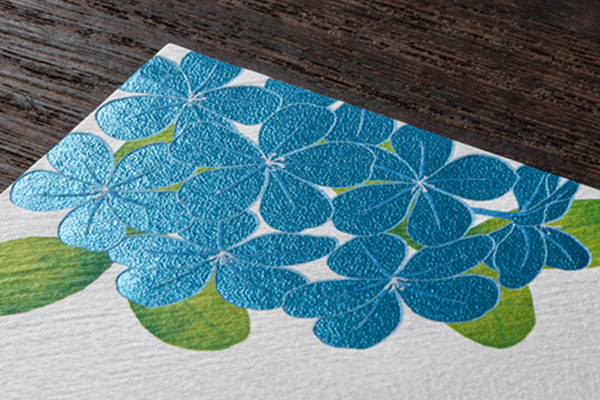 晩夏まで長期間にわたって次々と開花するルリマツリ。涼しげなルリ色の花を、青いメタリック箔で表現しました。