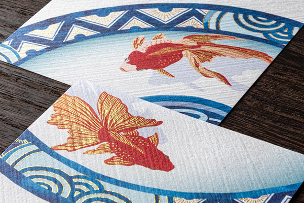 青絵鉢に泳ぐ金魚に繊細な金シルク印刷を施し、涼しげな夏の風景を表現しました。