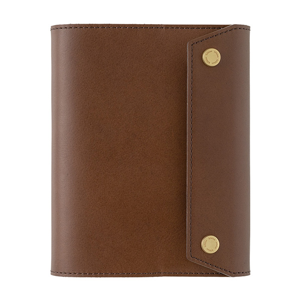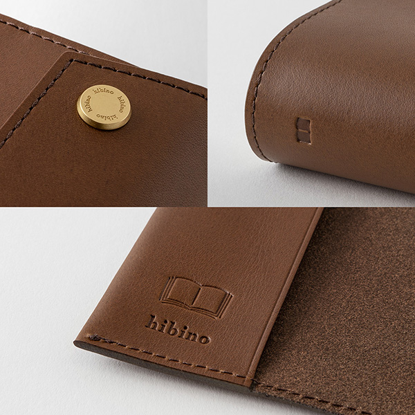 真鍮製のスナップパーツはhibinoオリジナルの刻印入り。表紙と背にhibino本体とお揃いのデザインの焼印を入れています。焼印がしっかりと綺麗な色で出るように革の仕上げ方にもこだわりました。