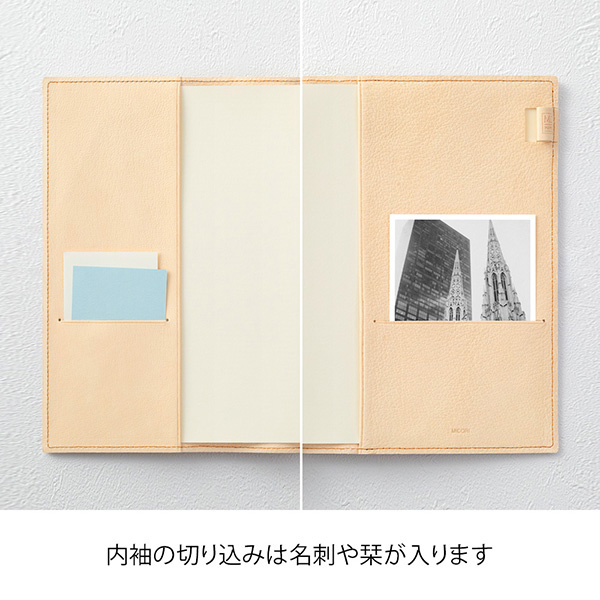 | 注意 | ●革そのものの風合いや経年変化を楽しむため、無着色で極力表面加工を控えています。 そのため、多少シワやシミがありますが、使うほどになじみ目立たなくなります。 ●「MDノート」「MDノート ダイアリー」専用のノートカバーです。 ※「MDノート ダイアリー 1日1ページ」「MDノート ジャーナル 1日1ページ」にはご使用いただけません。 ●「MDノート ライト」は2冊収納が可能です。 ※他社のものはサイズが異なり入らないことがありますのでご注意ください。 |
