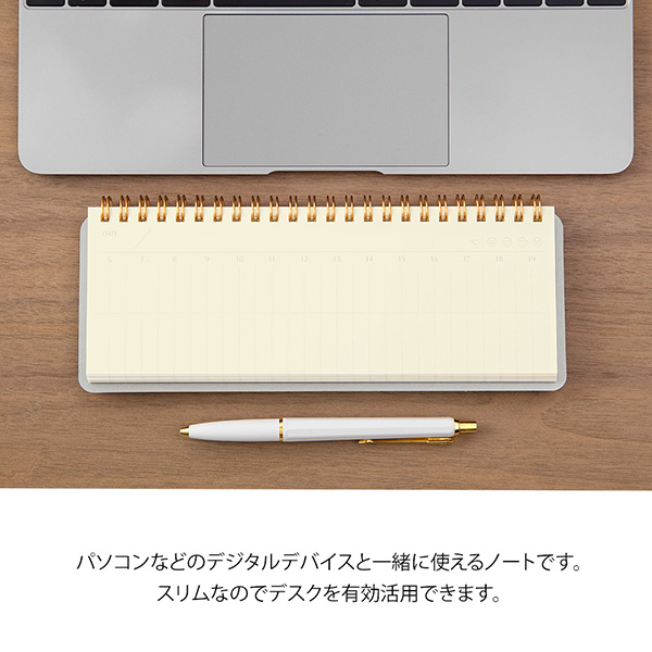 横長のスリムなノートなので、パソコンやキーボード手前の狭いスペースに置いて書き込むことができます。