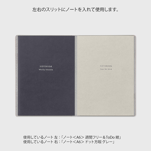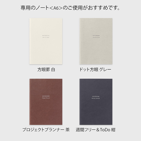 | 備考 | ●こちらの商品には、「リフィルノート<A6>」>>(64ページ、厚み4mm)「リフィルメモパッド<A6>」>>(70ページ、厚み7mm)を入れていただくことをおすすめしております。 ※これより厚いノートを2冊ご利用の際は、入らないことがありますのでご注意ください。 ●ミドリオンラインストア限定商品のため、他店では発売しておりません。 |