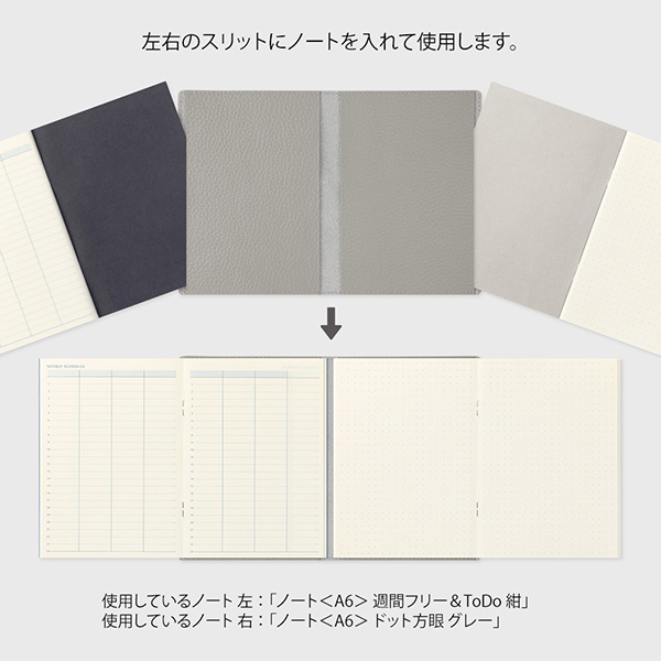 セットの仕方は簡単。両サイドからノートを挿していただくと、2冊のノートを同時に開いてお使いいただくことができます。