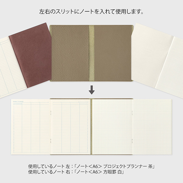 セットの仕方は簡単。両サイドからノートを挿していただくと、2冊のノートを同時に開いてお使いいただくことができます。