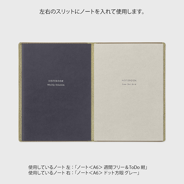 | 備考 | ●こちらの商品には、「リフィルノート<A6>」>>(64ページ、厚み4mm)「リフィルメモパッド<A6>」>>(70ページ、厚み7mm)を入れていただくことをおすすめしております。 ※これより厚いノートを2冊ご利用の際は、入らないことがありますのでご注意ください。 ●ミドリオンラインストア限定商品のため、他店では発売しておりません。 |
