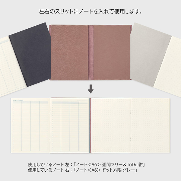 セットの仕方は簡単。両サイドからノートを挿していただくと、2冊のノートを同時に開いてお使いいただくことができます。