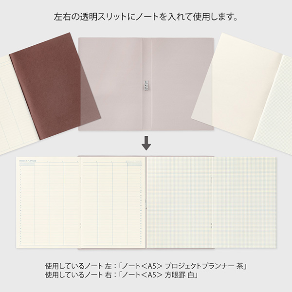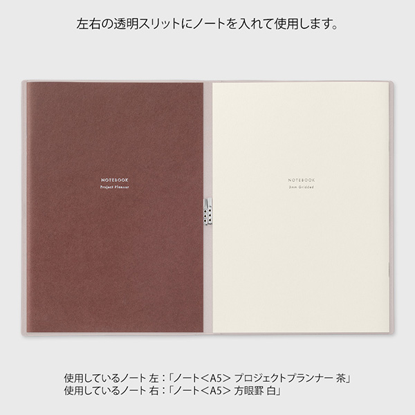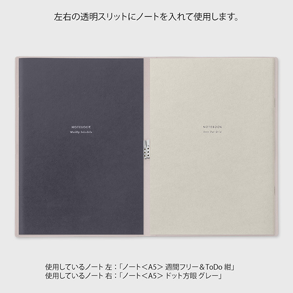 セットの仕方は簡単。両サイドからノートを挿していただくと、2冊のノートを同時に開いてお使いいただくことができます。