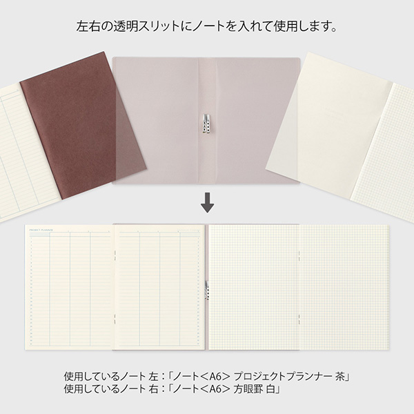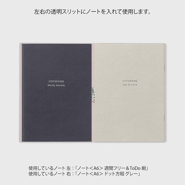 セットの仕方は簡単。両サイドからノートを挿していただくと、2冊のノートを同時に開いてお使いいただくことができます。