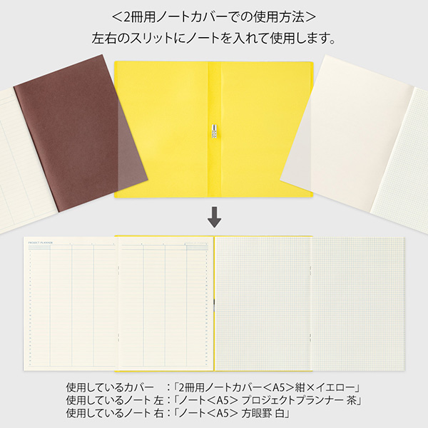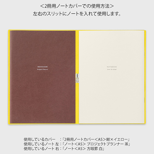 両サイドからノートを挿していただくと、3mm方眼とプロジェクトプランナー、5mmドット方眼と週間フリー+ToDoなど、組み合わせを自由に2冊のノートを同時にお使いいただくことができます。