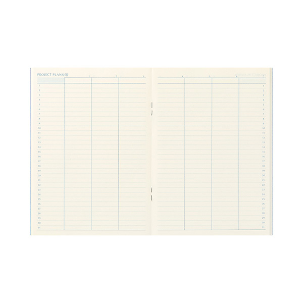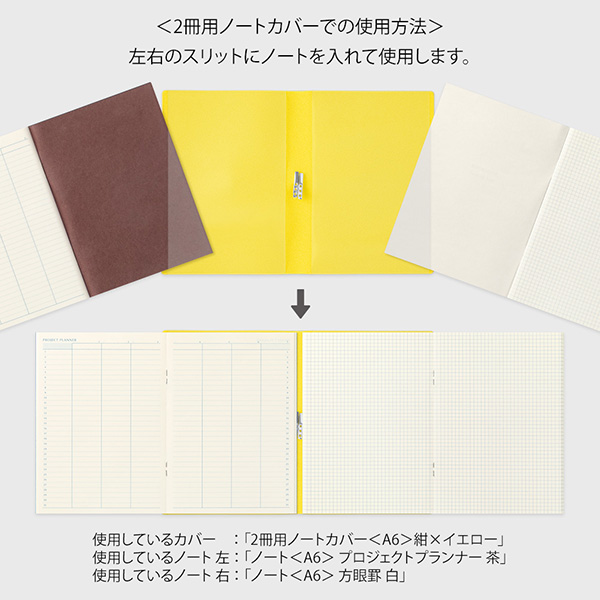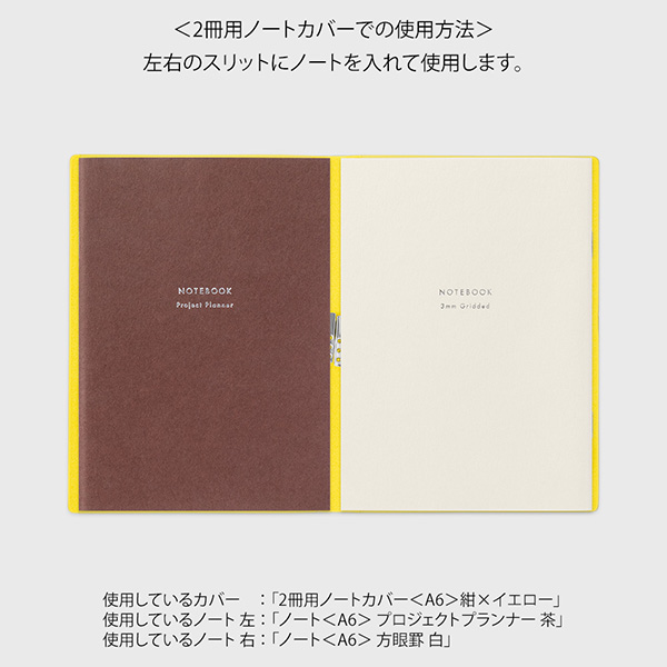 両サイドからノートを挿していただくと、3mm方眼とプロジェクトプランナー、5mmドット方眼と週間フリー+ToDoなど、組み合わせを自由に2冊のノートを同時にお使いいただくことができます。