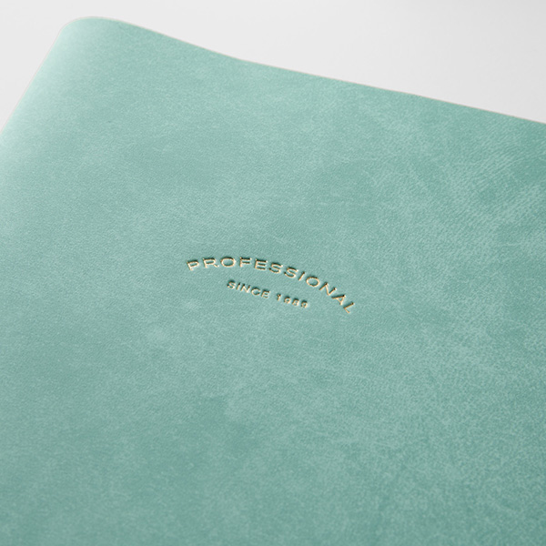 うっすらとテクスチャーが入った青緑色の生地にきらっと光る金箔のロゴがワンポイント。当店オリジナルカラーのPRDです。
