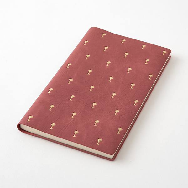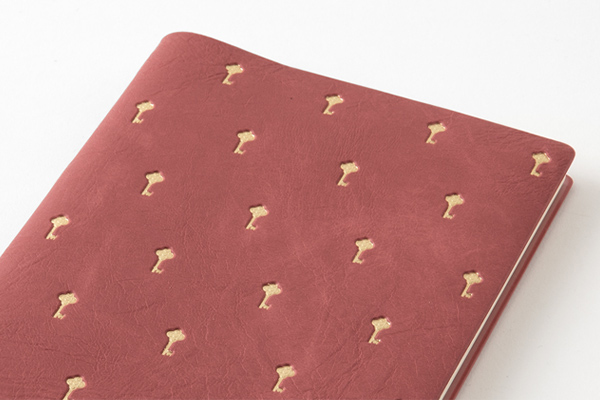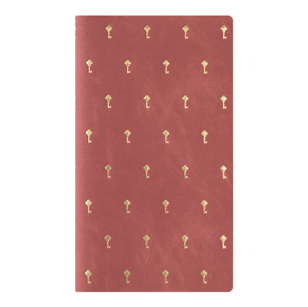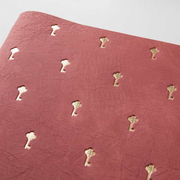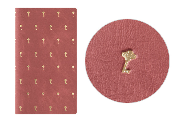 エンボスが入った柔らかな赤色の生地に、鍵柄の箔押しを合わせた、落ち着いた雰囲気の表紙です。 ミドリオンラインストアのスタッフが生地×柄(箔)の組み合わせを考えた、当店オリジナルデザインのPRDです。