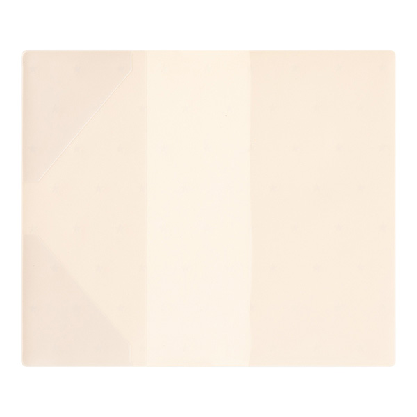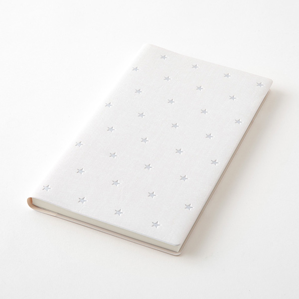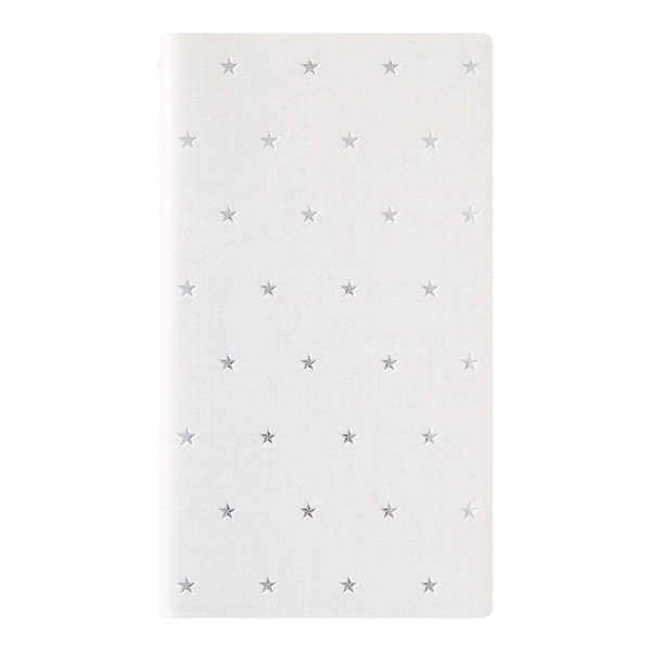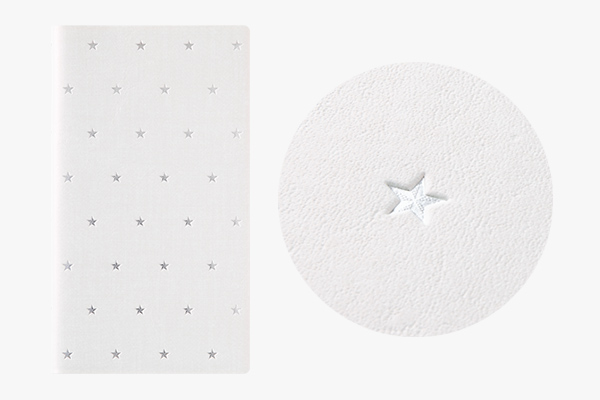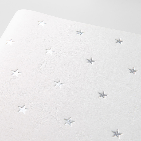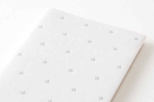 光沢感のあるパールホワイトの生地に星柄の箔押しを合わせた、おしゃれな雰囲気の表紙です。 ミドリオンラインストアのスタッフが生地×柄(箔)の組み合わせを考えた、当店オリジナルデザインのPRDです。